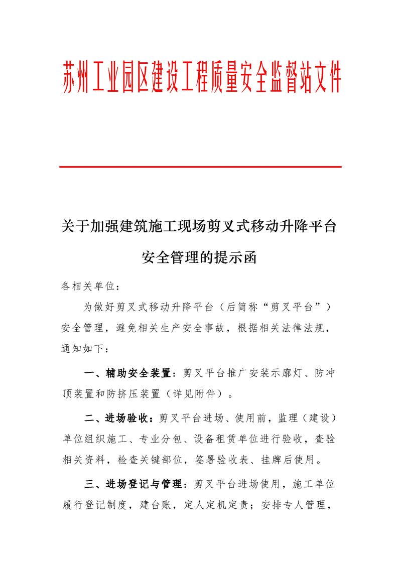 關于加強建筑施工現場剪叉式移動升降平臺安全管理的提示函