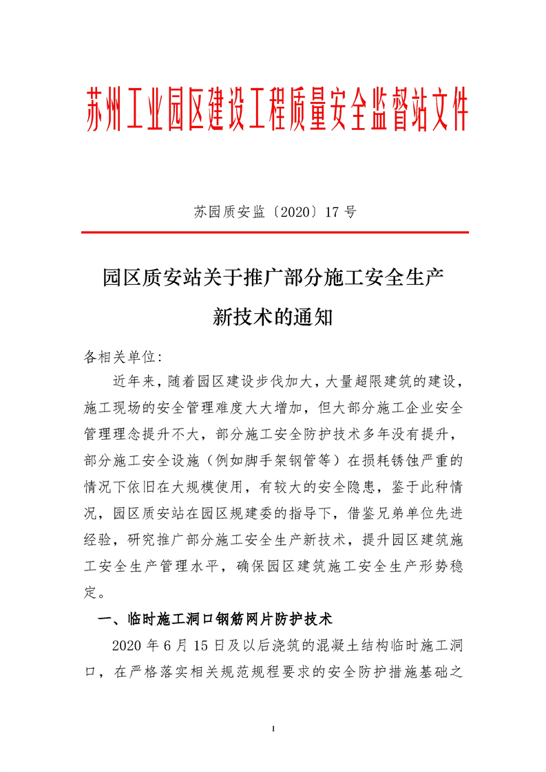園區質安站關于推廣部分施工安全生產新技術的通知