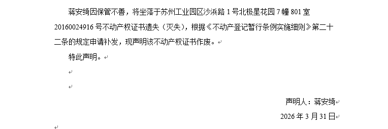 關(guān)于蘇州工業(yè)園區(qū)沙浜路1號(hào)北極星花園7幢801室20160024916號(hào)不動(dòng)產(chǎn)權(quán)證書(shū)遺失聲明