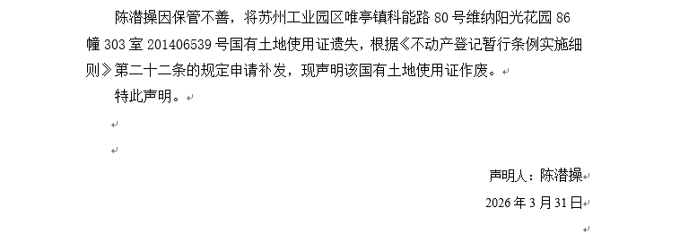 關于蘇州工業(yè)園區(qū)唯亭鎮(zhèn)科能路80號維納陽光花園86幢303室201406539號國有土地使用證遺失聲明