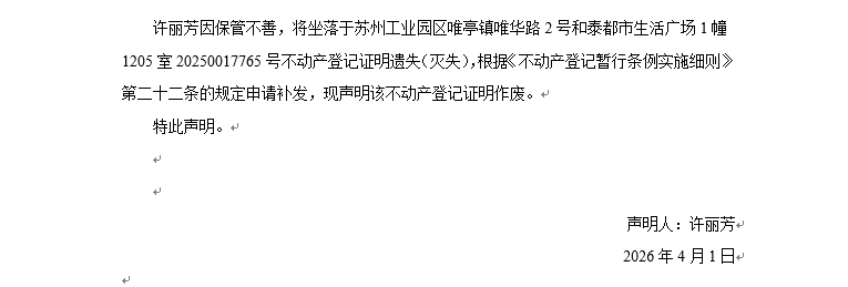 關于蘇州工業園區唯亭鎮唯華路2號和泰都市生活廣場1幢1205室20250017765號不動產登記證明遺失聲明