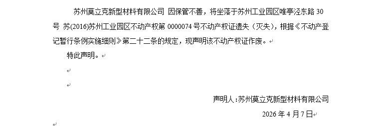關(guān)于蘇州工業(yè)園區(qū)唯亭涇東路30號(hào) 蘇(2016)蘇州工業(yè)園區(qū)不動(dòng)產(chǎn)權(quán)第0000074號(hào)不動(dòng)產(chǎn)權(quán)證遺失(滅失)聲明
