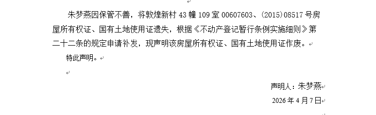 關于敦煌新村43幢109室00607603、(2015)08517號房屋所有權證、國有土地使用證遺失聲明