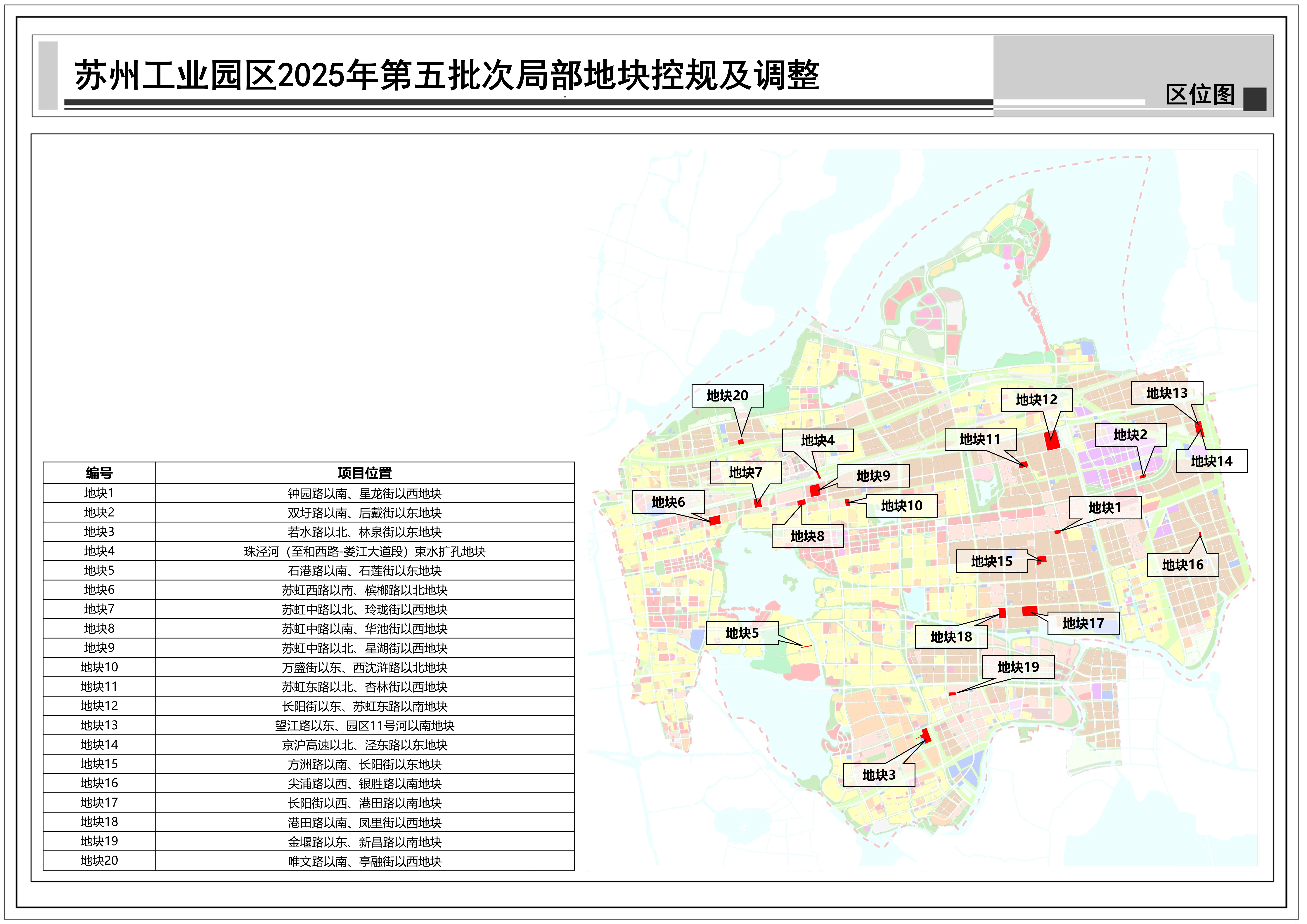 蘇州工業(yè)園區(qū)2025年第五批次局部地塊控規(guī)及調(diào)整:共包括20個(gè)地塊,總用地面積約1.26平方公里,詳見(jiàn)附圖區(qū)位圖。