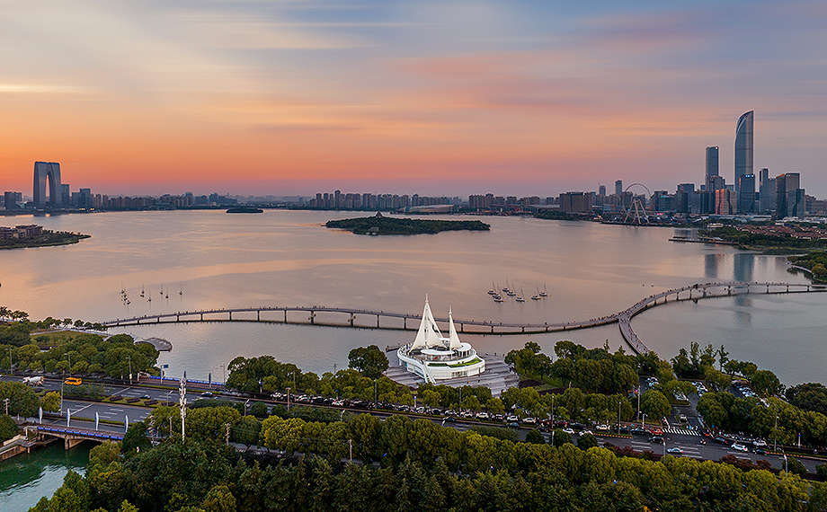 在開發(fā)建設(shè)30周年之際,園區(qū)積極以新載體撬動(dòng)經(jīng)濟(jì)“新引擎”。金雞湖驛站改造是環(huán)金雞湖區(qū)域綜合提升工程中的重要舉措。其中,金雞驛06館位于望湖角帆船碼頭,緊鄰金水灣棧橋,定位為集水上運(yùn)動(dòng)、餐飲和公共服務(wù)為一體的綜合服務(wù)設(shè)施。驛站頂部設(shè)有巨型帆船雕塑,與湖邊停泊的點(diǎn)點(diǎn)帆船,構(gòu)成了時(shí)尚美麗的城市風(fēng)景線。