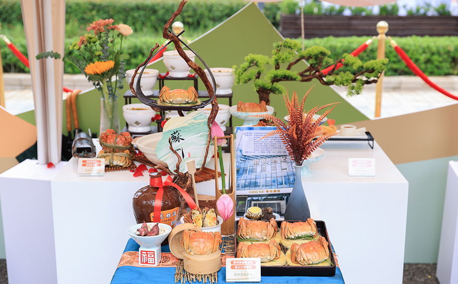 在菜品展示區(qū)旁邊,還有同期開(kāi)市的比斯特蘇州購(gòu)物村“交個(gè)螃友”湖畔大閘蟹市集,憨態(tài)可掬的大閘蟹文創(chuàng)玩偶、精致的大閘蟹糖畫以及各個(gè)創(chuàng)意蟹料理攤位也是人氣十足。