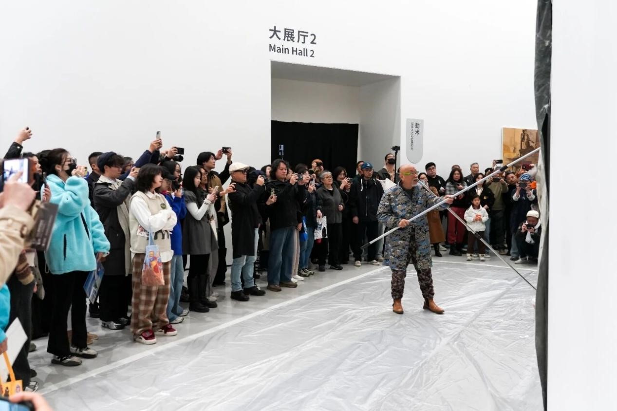 開幕現場,楊重光帶來即興藝術創作實踐,以舊帆布、廢紙、顏料等廢棄材料為創作媒介,將數十年人生閱歷與藝術思考融入創作,現場完成一件全新廢墟藝術作品。觀眾近距離觀摩作品從無到有的完整誕生過程,直觀感受廢墟藝術的現場張力,體悟藏于作品之中的生命溫度。
