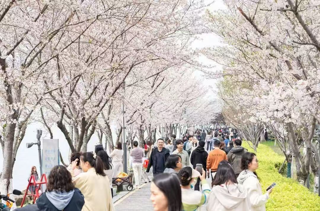 城市公園亦是市民游客放松身心的好去處,環(huán)金雞湖、獨(dú)墅湖、陽澄湖的城市公園內(nèi),同樣游人如織。市民游客踏春而來,在湖畔公園間邂逅春光,收藏獨(dú)屬于園區(qū)的春日盛景,湖濱公園、白塘公園、仙櫻湖公園、白鷺園等花開爛漫。右岸會客廳“飛翔”雕塑下,魯冰花正熱烈盛放,挺拔的花穗層層疊疊、深淺暈染,打卡游客絡(luò)繹不絕;世尊櫻花大道、現(xiàn)代大道櫻花如云似霞,陸涇路海棠花廊粉浪翻涌,游客們或駐足賞花、或拍照留念,沉醉在無邊春色里。