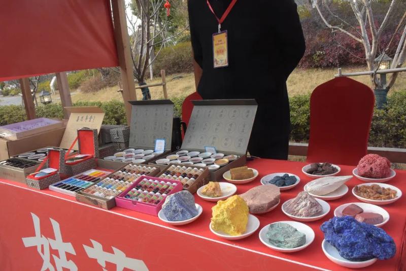 此次大會,張佰林不僅帶來了各色原材料,還帶來了多款針對不同用戶需求的12色國畫顏料,以及印泥、礦石標本等品類的相關產品。現場,他還積極與大家分享國畫顏料制作的工藝流程和產品特色,并邀請有興趣的市民游客去工廠體驗。