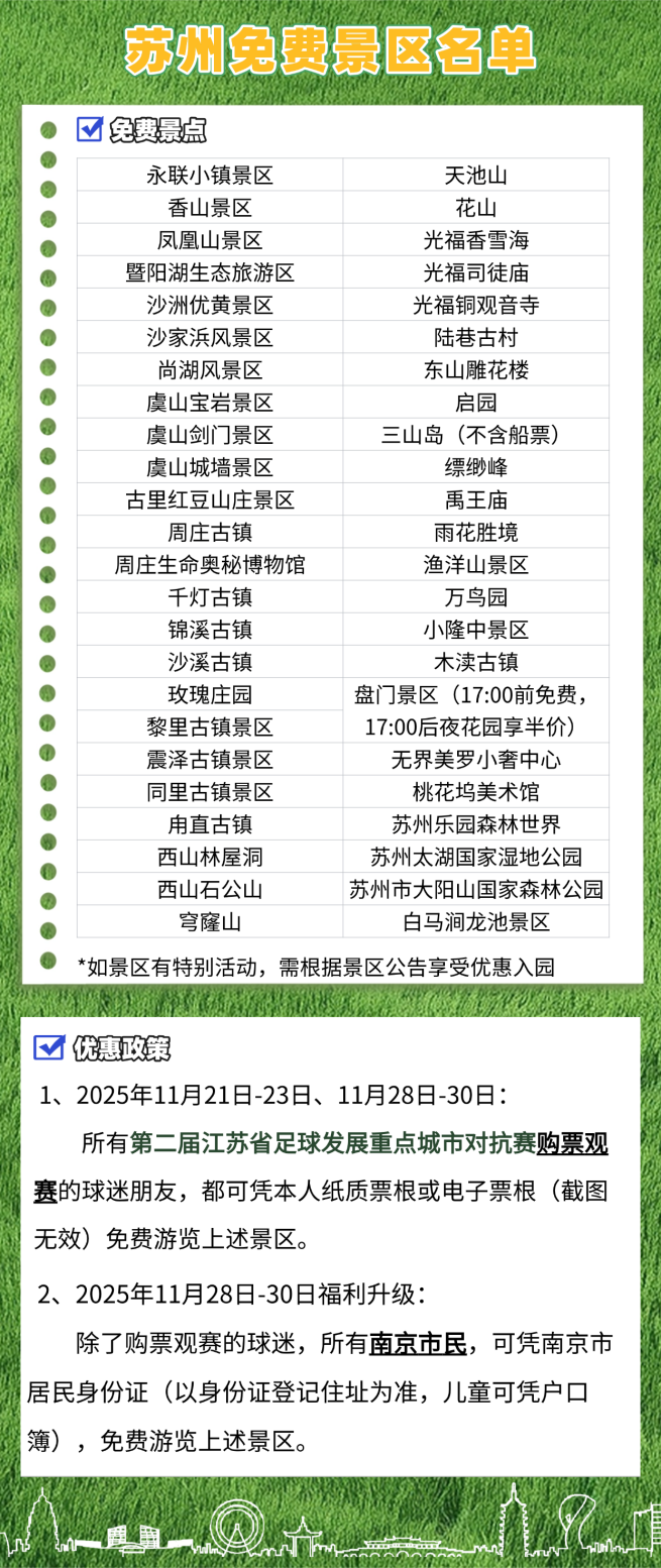 “蘇超”余溫未散,足球再掀熱潮。11月28日至30日,江蘇省足球發展重點城市對抗賽在蘇州奧體中心舉辦,期間賽事配套福利誠意拉滿:觀賽球迷憑本人賽事票根,可免費游覽蘇州40+景區,南京市民憑南京市居民身份證可同步享受這一福利,在觀賽間隙飽覽江南盛景。此外,一系列文旅消費券同步上線,涵蓋蘇式文創、景區門票、新奇體驗等品類,讓出行與消費更具性價比。