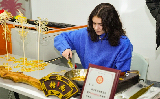 During the event, Li Yao, a fourth-generation inheritor of sugar painting techniques, gave the international students an introduction to the origin, development, spread and cultural connotations of sugar painting, and taught them to create patterns with this traditional handicraft.